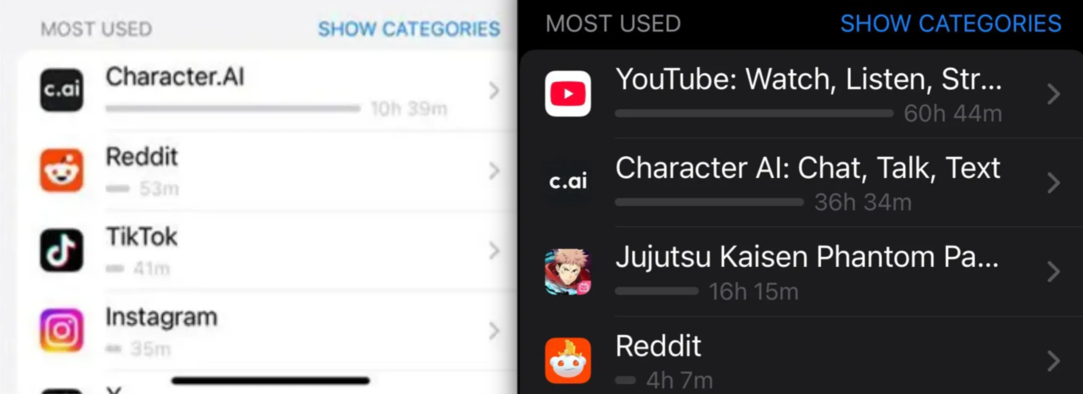 Character.ai is one of the most visited sites on the internet. In February 2025, they had over 20 million active users. Not only is it popular, its users are deeply engaged. On average, they spend two hours a day chatting with artificial characters. On the /r/CharacterAI subreddit, users post their screen time and some proudly share spending most of their entire day with their bots.